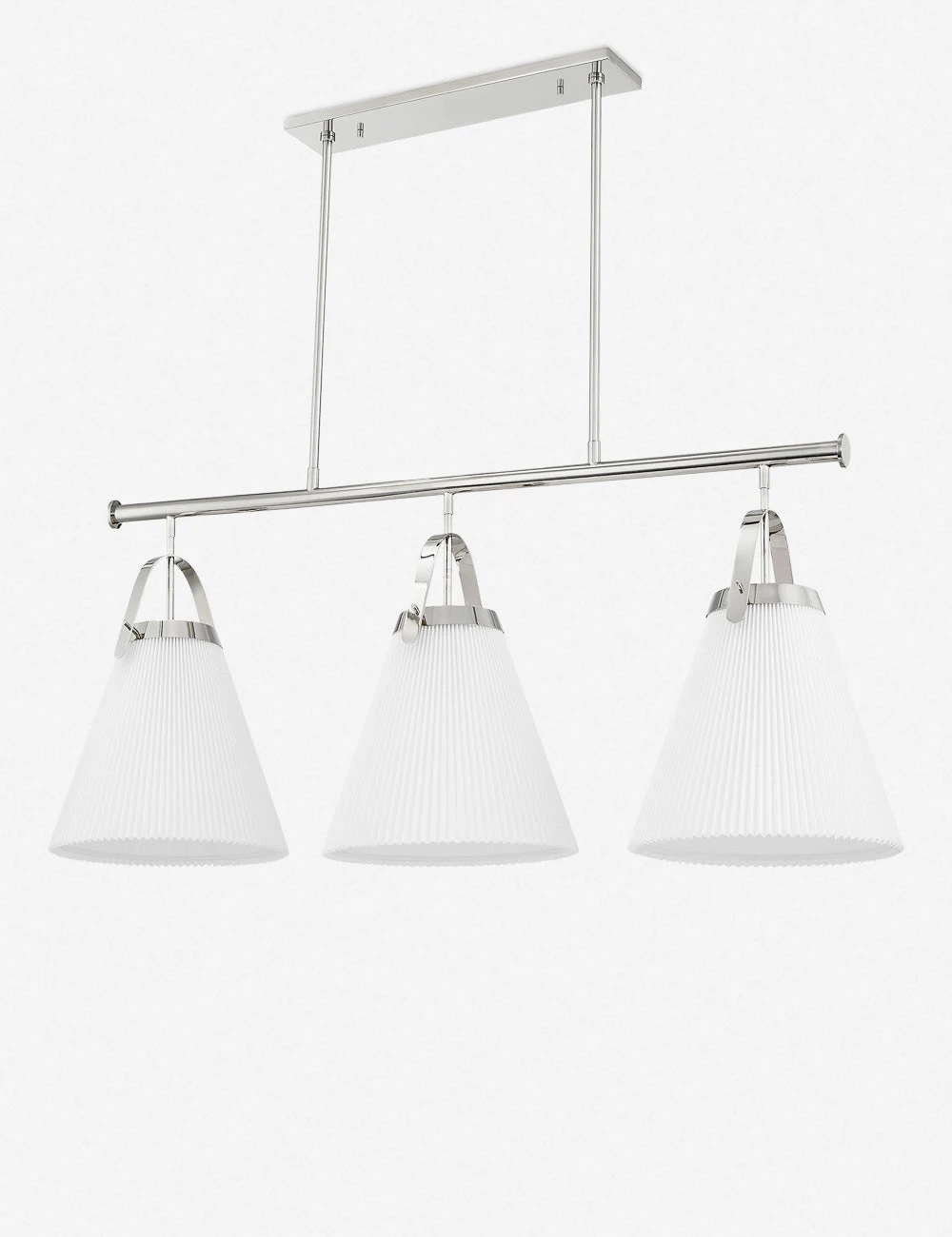 This chic pendant light fixture updates classic notes with a modern, streamlined silhouette. The sleek metal frame holds three lights with ruffled Belgian linen shades in a linear pendant design that’s set for transitional appeal.