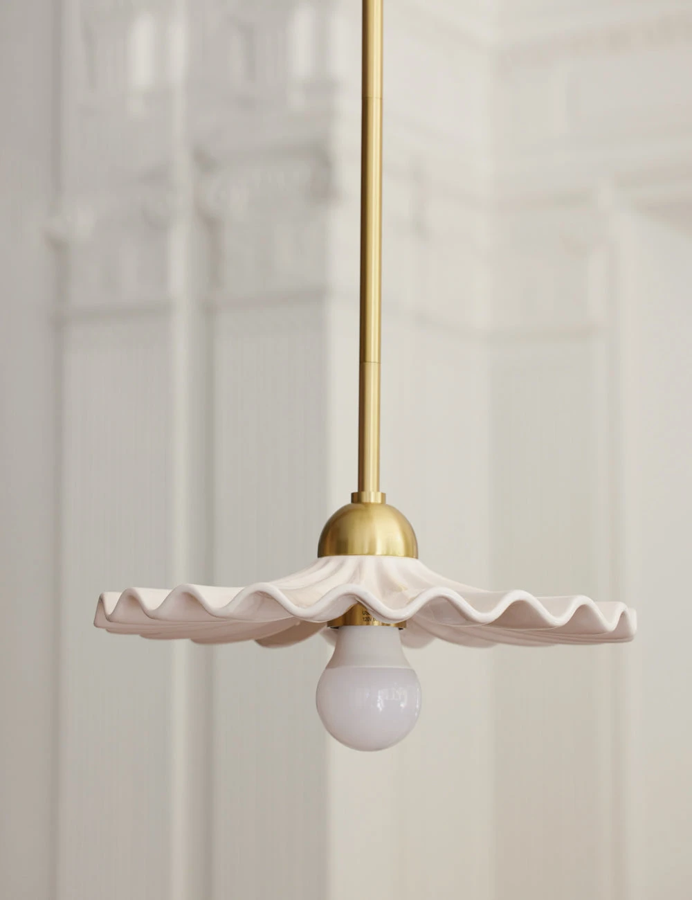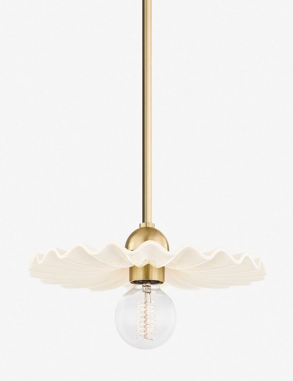 Refresh your lighting design with the delicate yet dynamic silhouette of the Madrona pendant. The ruffled form of the shade catches the light, offering sculptural contrast against the clean lines and polished luster of the antique brass finished fixture. You can hang this damp-rated pendant in your lounge, kitchen, or bathroom for a stunning overhead feature.