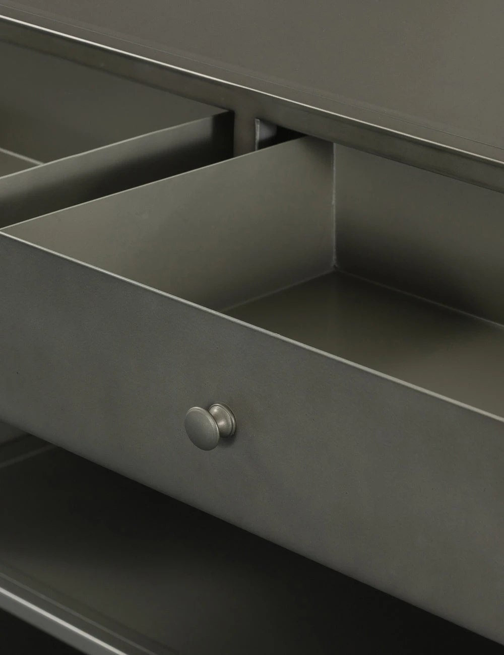 In a sleek nod to a shadow box design, this cabinet features an iron frame with glass doors for storage and display. The Malcom Small Curio Cabinet offers two drawers and shelving for a clean look with an industrial edge.