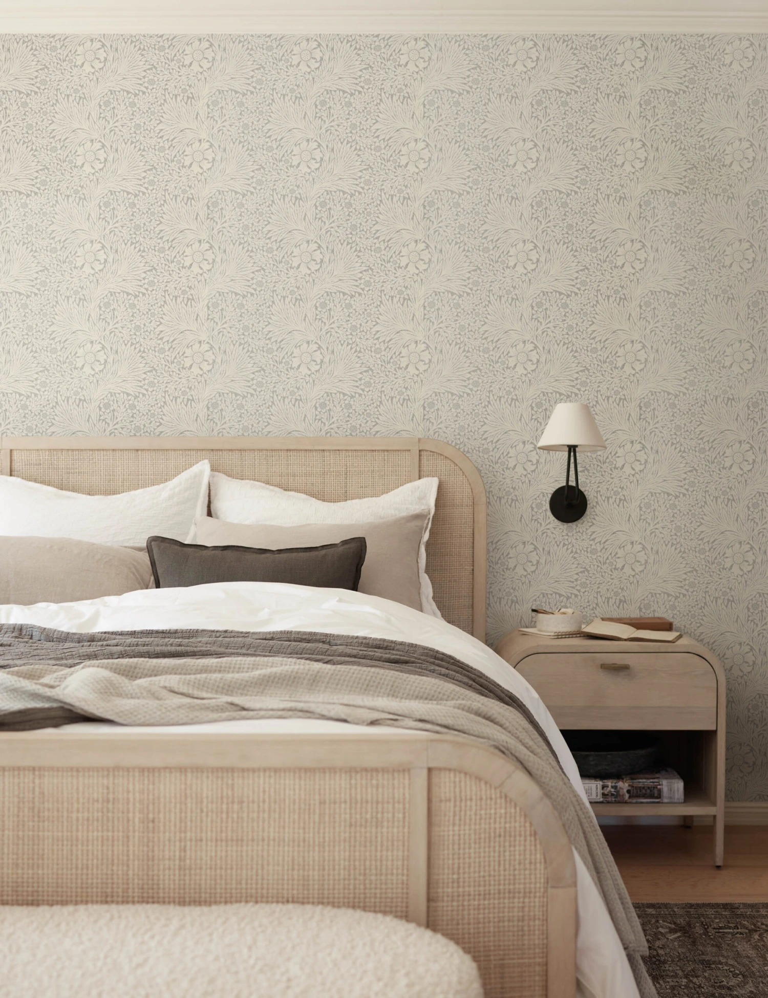 Showcasing one of Morris & Co’s most iconic patterns, “Marigold,” this floral wallpaper brings subtle sophistication and charm to your walls with its calming neutral hues and whimsical botanicals.