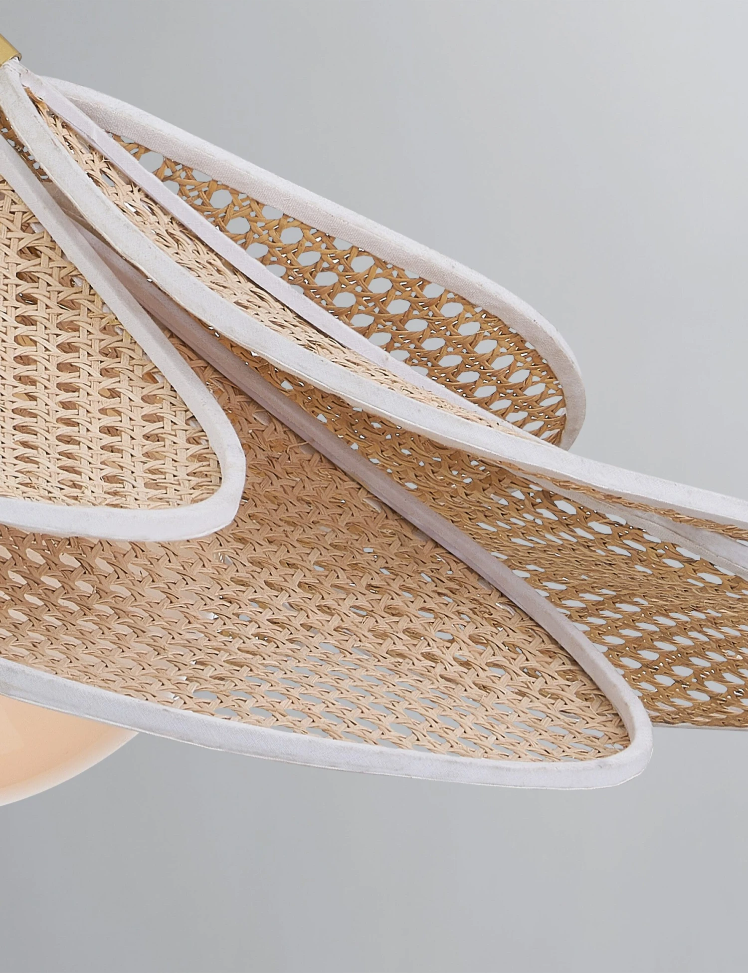 Create a sense of whimsy and texture overhead with this eye-catching pendant. The opal glass globe is layered in petal-like shades fashioned from rattan and trimmed in cotton—offering a floral-inspired pendant light perfect for a bright and airy space.