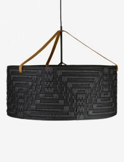 Inspired by Italian basket weaving techniques, this modern chandelier features a rattan drum shade suspended by leather straps. The intricate, handwoven pattern offers endless artisan craftsmanship in a large chandelier design that blends dynamic style with natural textures.