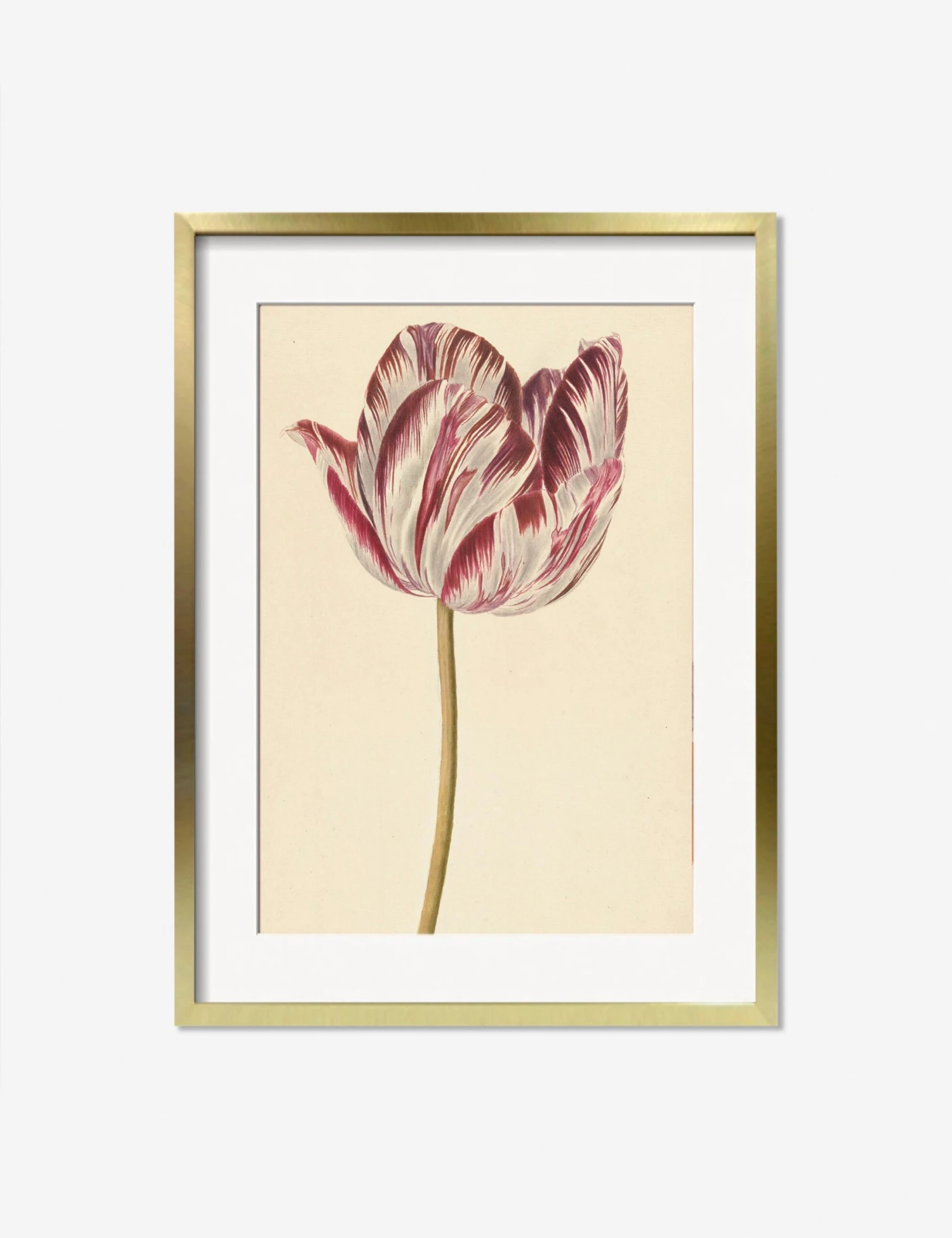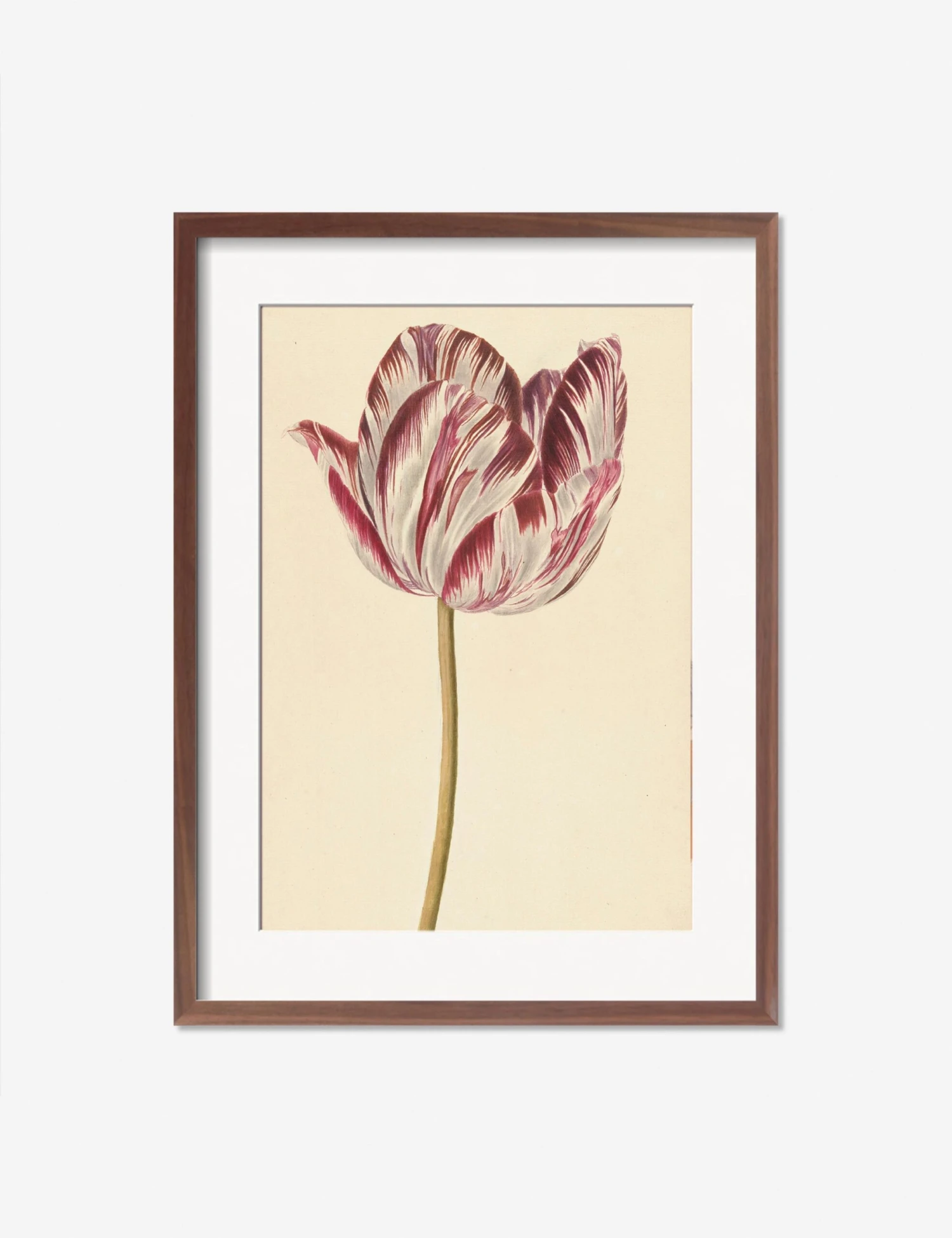 This wall art print features a tulip in bloom against a neutral backdrop offering a delicate study in texture and form. The shading on the stem and wispy lines of color on each petal offers a striking elegance for transitional wall decor.