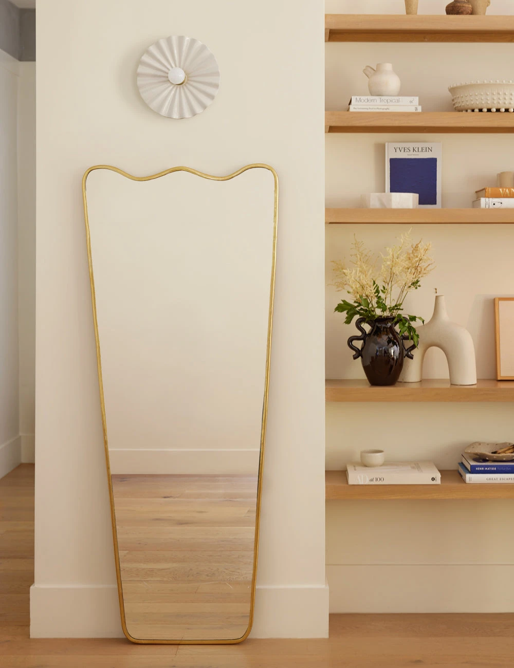 A clean design and wavy silhouette give this slim-framed mirror its chic appeal. In a ready-to-hang design, this full length mirror can add a touch of glamour and charm to any bedroom or living space. This piece is from our exclusive Sarah Sherman Samuel collaboration and features all the trademarks of her warm, edited style.